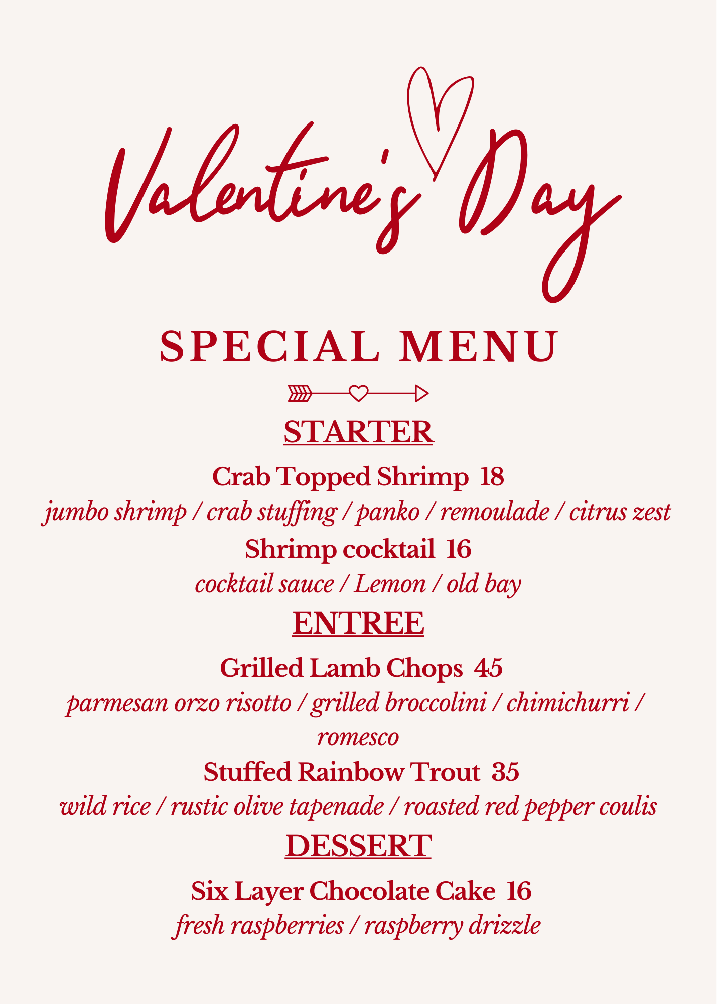 Oven Baked Chicken with Rosemary au jus | NC Roasted Pork Loin with lemon caper butter sauce | House Cured Bacon Mac n' Cheese | Braised Short Rib | Seared Salmon with beurre blanc sauce | Bolognese with fettuccine, mozzarella, and pesto garnish | Brisket Burnt Ends with house bbq sauce | Pulled Pork BBQ with house bbq sauce | Shrimp and Grits with an andouille sausage gravy | Sticky Baby Back Ribs
